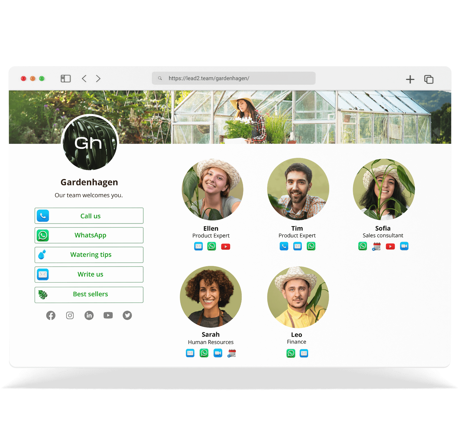 Muestra tus asesores y departamentos en tu sitio web. Los usuarios podrán elegir entre múltiples canales e interactuar.