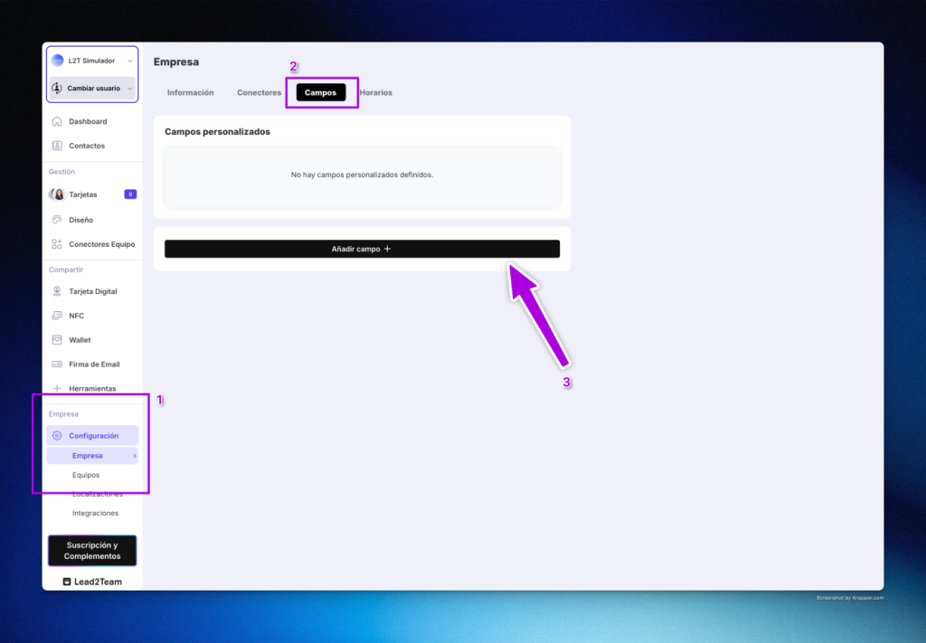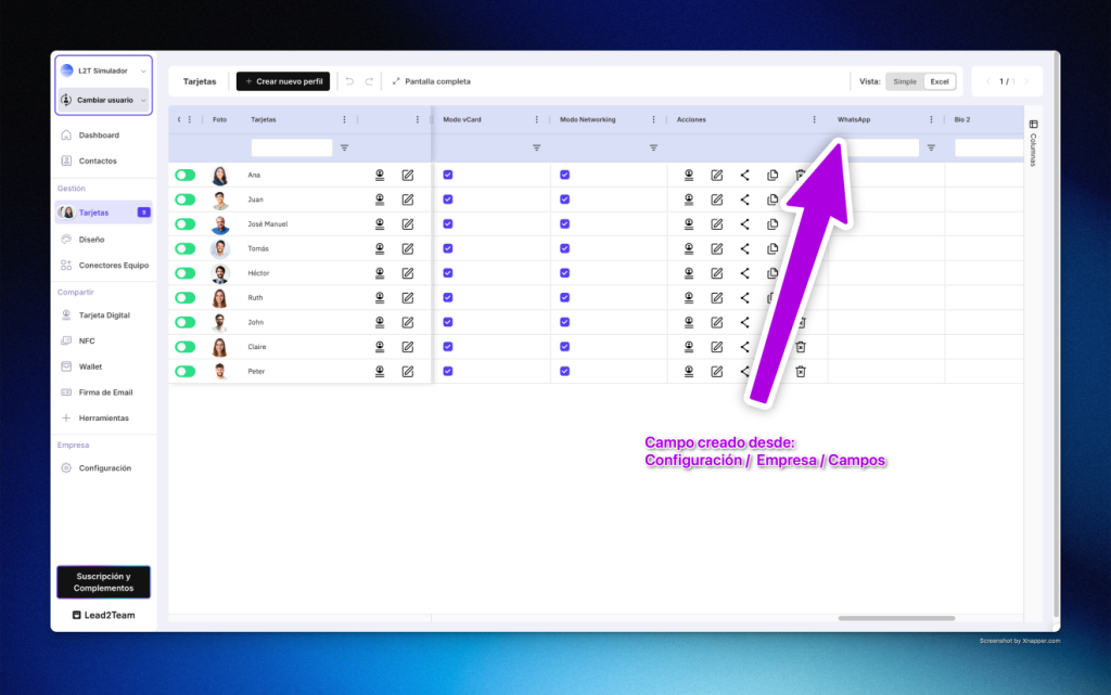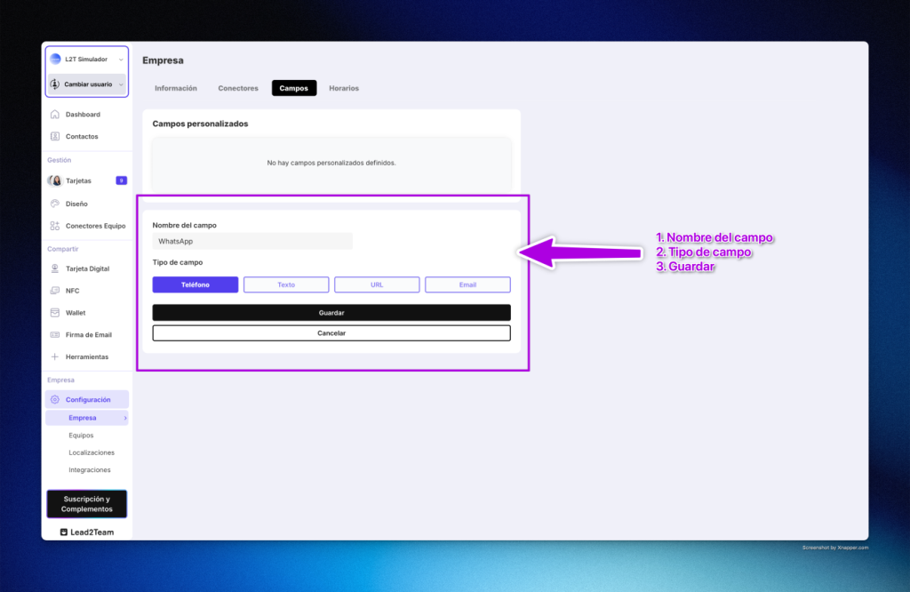 You can define fields of type text, link o number. For example, if you want the cards to also include a number of WhatsAppIf you want to create a new field, just create a new field of type number and name it.